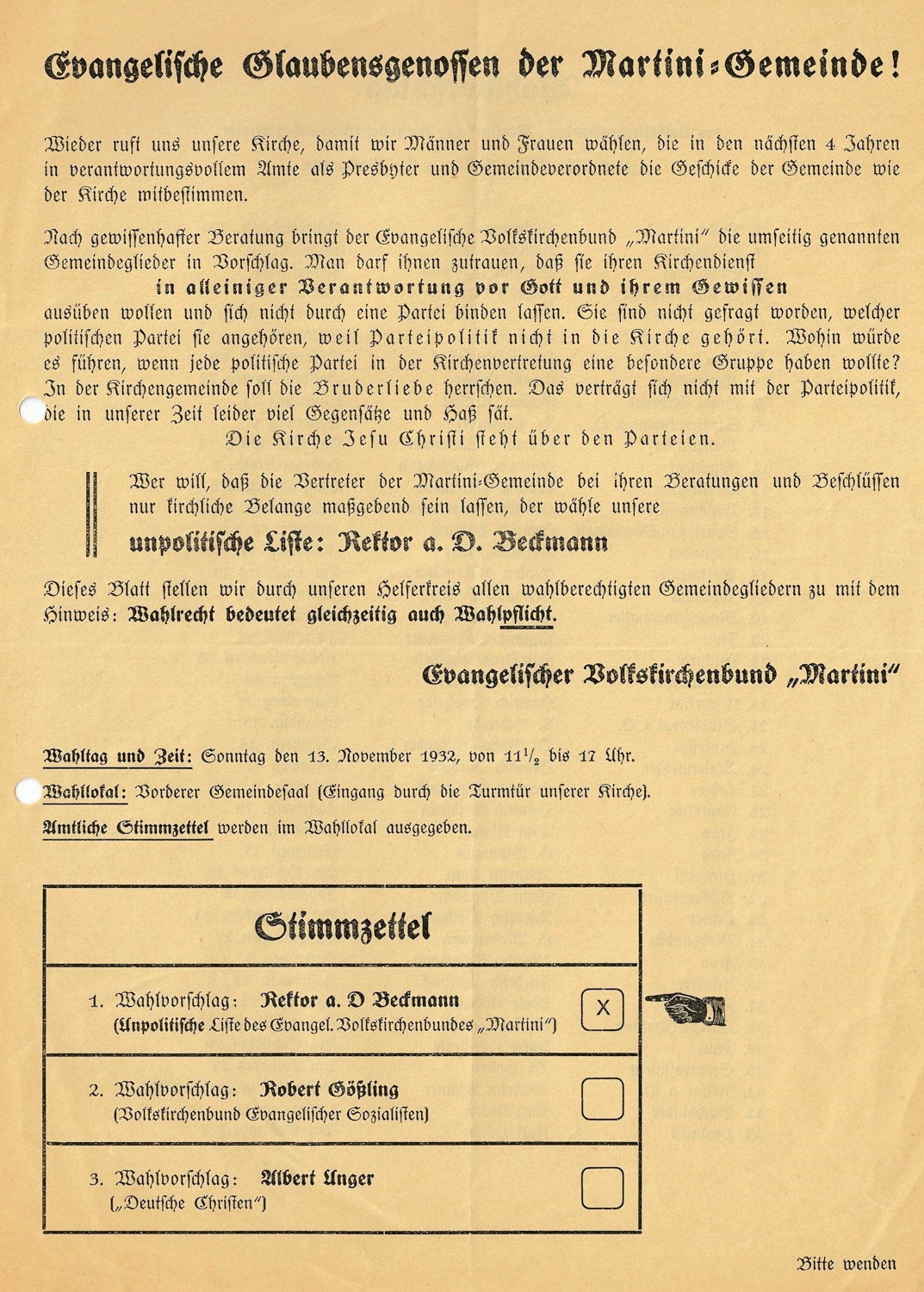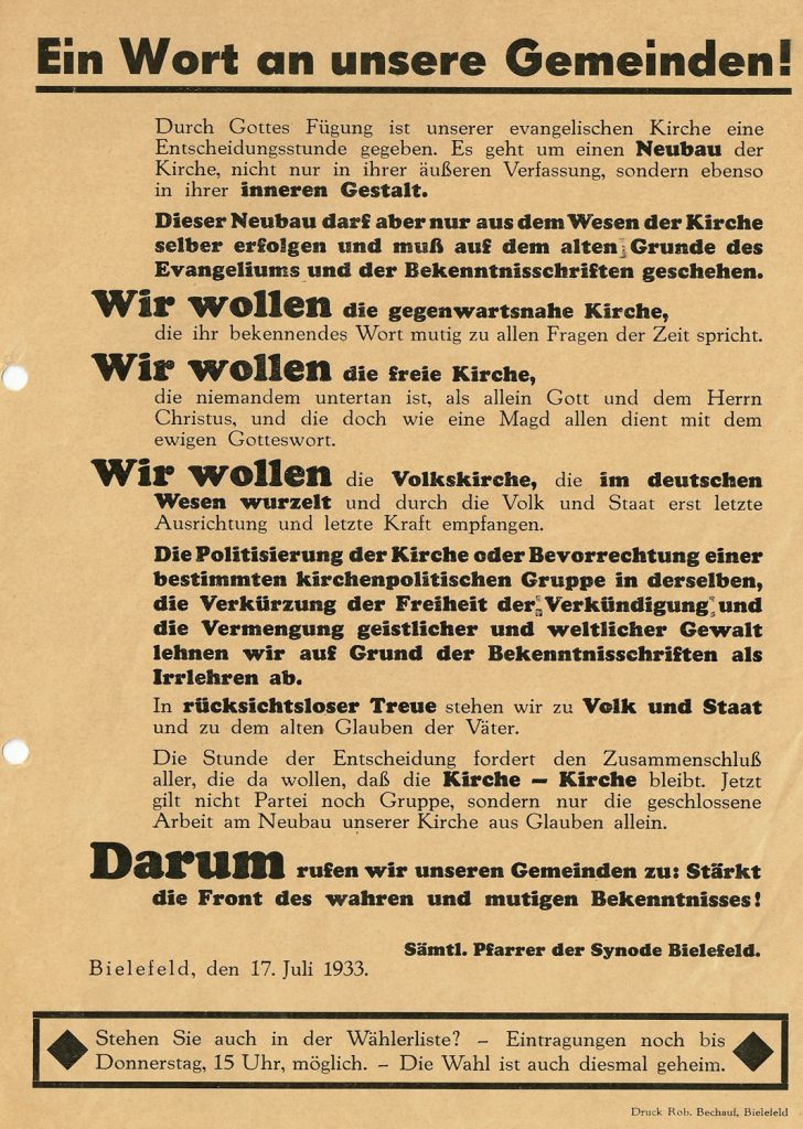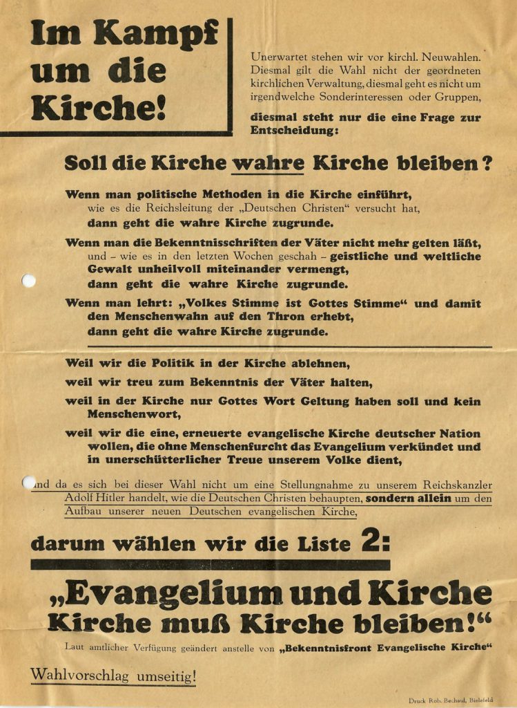 In den folgenden Jahren sollte die NSDAP-Führung dann jedoch immer rigoroser gegen die Kirchen und ihre Vertreter vorgehen, um so deren gesellschaftlichen Einfluss einzudämmen und die politisch-ideologische Gleichschaltung weiter voranzutreiben. Nachdem es schon länger den Wunsch nach einer einheitlichen, starken Nationalkirche gegeben hatte, erfolgte mit der Gründung der Deutschen Evangelischen Kirche (DEK) am 11. Juli 1933 schließlich die Vereinigung der zuvor im Deutschen Evangelischen Kirchenbund nur locker zusammengeschlossenen evangelischen Landeskirchen. Aus den nur zwei Wochen später stattfindenden reichsweiten Kirchenwahlen ging die der NS-Ideologie verhaftete Glaubensbewegung der „Deutschen Christen“ (kurz: DC) mit rund 70 Prozent der abgegebenen Stimmen als klarer Sieger hervor. Die „Jungreformatorische Bewegung“, eine Gruppe von Pastoren und Theologen, die sich erst im Mai 1933 gegen die wachsende Einflussnahme der DC zusammengeschlossen hatte, vermochte diesem „Gleichschaltungsrausch im evangelischen Bevölkerungsteil“ (Olaf Blaschke) nur wenig entgegenzusetzen. Infolge ihres erdrutschartigen Wahlsieges kontrollierten die DC nun die Kirchenleitungen der meisten evangelischen Landeskirchen; letztere wurden von Kritikerinnen und Kritikern fortan auch als „zerstörte Kirchen“ bezeichnet. Und auch der zum ersten Reichsbischof designierte Pastor Friedrich von Bodelschwingh d.J. (1877-1946), früher Leiter der Anstalt Bethel (heute v. Bodelschwinghsche Stiftungen Bethel), der von der „Jungreformatorischen Bewegung“ favorisiert wurde, beugte sich schon bald dem Druck des preußischen Kulturministeriums und ebnete damit den Weg für den von Hitler persönlich protegierten DC-Kandidaten Ludwig Müller. Das Ziel der NS-Führung, die völlige Gleichschaltung der protestantischen Kirche von innen heraus, schien nun in greifbarer Nähe. Im weiteren Verlauf des Jahres 1933 formierte sich jedoch auch zunehmend Widerstand gegen das „deutsch-christliche“ Kirchenregiment.