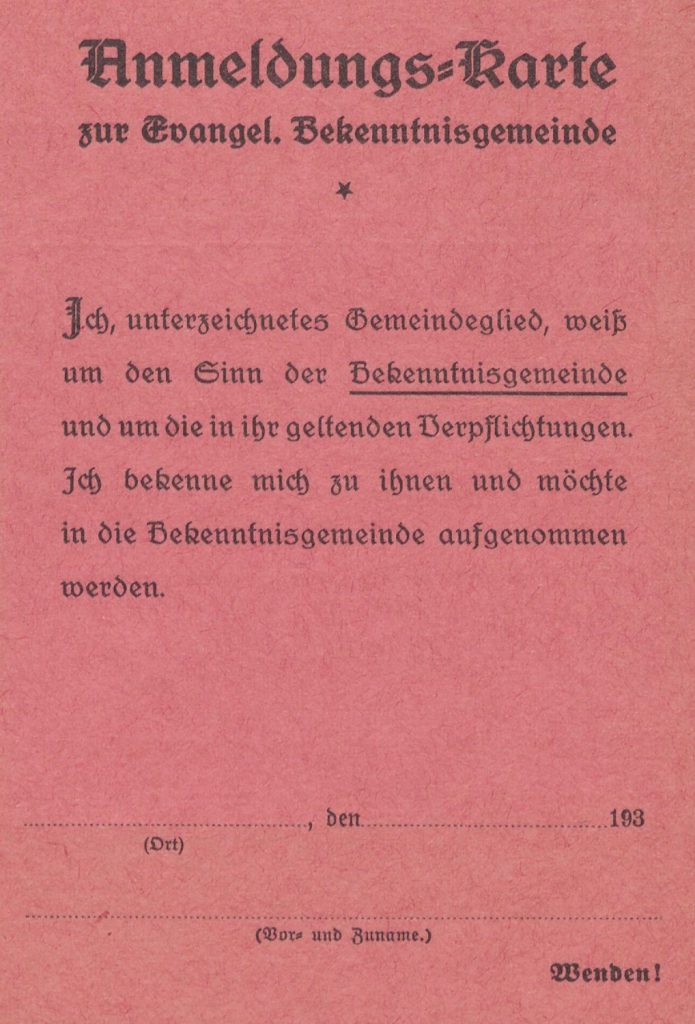 Für großen Unmut sorgte zudem, dass konfessionelle Vereine und Verbände sich nach und nach entweder auflösen oder in die NS-Einheitsorganisationen eingliedern lassen mussten, wodurch die Arbeit der Kirchen zusehends allein auf die Seelsorge beschränkt wurde. Um sich von der „deutschchristlichen“ Bewegung und den Eingriffen der Reichskirchenregierung zu distanzieren, proklamierte eine Bekenntnisgemeinschaft aus Pfarrernotbund, freien Synoden und einigen Kirchenvertretern in der Ulmer Erklärung am 22. April 1934 die „Bekennende Kirche“ (kurz: BK), die sich fortan als die „rechtmäßige evangelische Kirche Deutschlands“ verstand.