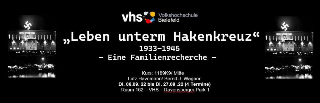 „In unseren Alben finden wir zahlreiche Briefe und Fotografien von Familienmitgliedern aus der Zeit des Nationalsozialismus. Sie tragen eine Uniform des BDM oder der Hitlerjugend, haben ein Hakenkreuz am Revers, tragen Uniformen der Wehrmacht. Was haben unsere Verwandten, Eltern, Großeltern, Onkel und Tanten in der Zeit des Nationalsozialismus und Zweiten Weltkrieges gemacht? Gibt es Quellen, die Auskunft über ihr Leben, ihr Schicksal geben können. In diesem Kurs wollen wir zu unserer Familiengeschichte recherchieren, Wege zu Archiven und Informationen aufzeigen.“