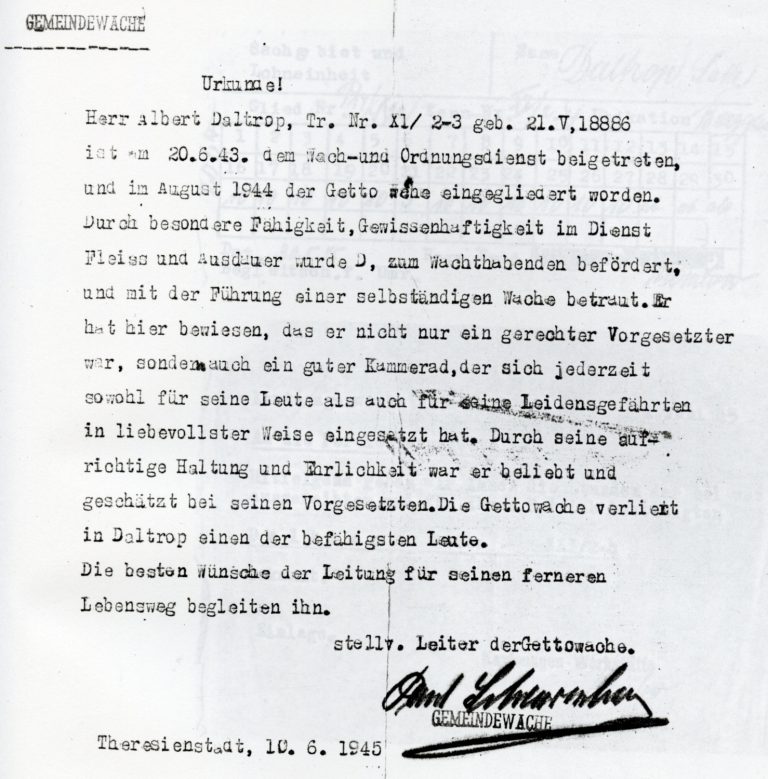 Am 12. Mai 1943 wurden Albert und seine Frau Charlotte „Lotte“ nach Theresienstadt deportiert. Dort mussten sie unter schlechten Bedingungen Zwangsarbeit leisten. Sie waren hungrig und krank. Das Ghetto führte strenge Aufzeichnungen über sie, z.B. Arbeitspapiere und Bankkarten. Albert gehörte zum Ordnungsdienst im KZ, was ihm möglicherweise sein Überleben ermöglichte. Sie blieben bis Juni 1945 im Lager, bevor sie befreit und mit Bussen zurück nach Bielefeld gebracht wurden.