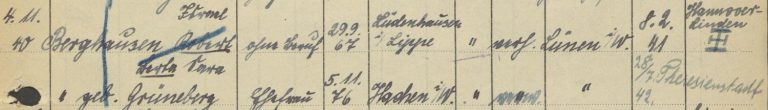 Berta Berghausen, geborene Grüneberg am 27. Oktober 1876 in Hachen/Westfalen, lebte mit ihrer Familie über 25 Jahre in Lünen in der Langen Straße. Ihr Mann Robert, geboren 29. September 1867 in Lüdenhausen war Viehhändler. Sie hatten drei gemeinsamen Kinder: Julius, geboren am 8. Dezember 1908 in Brake, Irmgard, geboren am 17. November 1911 in Brake und Ruth, geboren am 26. Februar 1913 in Lünen.