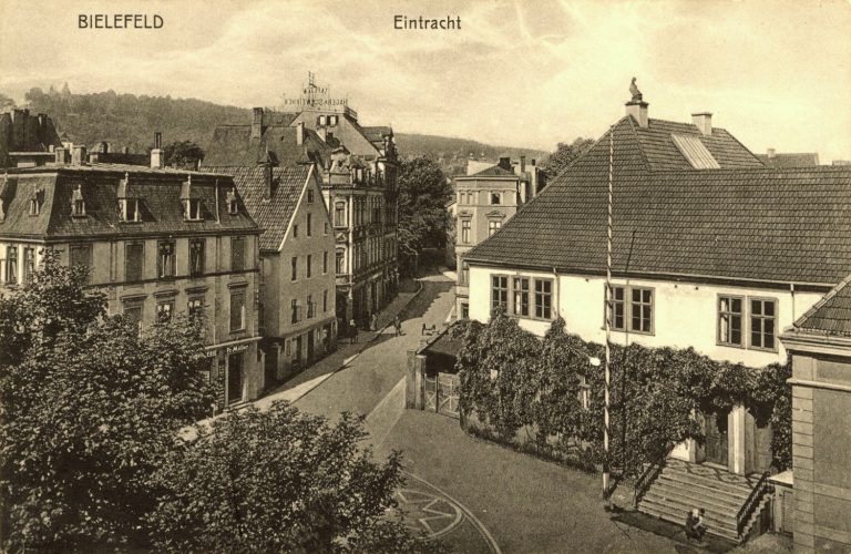 Das Gesellschaftshaus „Eintracht“ am Klosterplatz war insgesamt vier Mal eine Sammelstelle für Jüdinnen und Juden, bevor sie deportiert wurden. Die Deportationen fanden jeweils am 31. Juli 1942 nach Theresienstadt, am 2. März 1943 nach Auschwitz, am 12. Mai 1943 nach Theresienstadt und am 19. September 1944 nach Elben und Zeitz statt. Aufzeichnungen über die Situation im Gesellschaftshaus als Sammelstelle gibt es wenige – in Folge des alliierten Luftangriffs auf Bielefeld am 30. September 1944 wurde das Gebäude mit dem hauseigenen Archiv zerstört. Eine vorliegende Information ist, dass für die Deportation am 19. September 1944 die Verbliebenen der jüdischen Gemeinde die im Gesellschaftshaus Eingewiesenen besuchten und sie mit Verpflegung versorgten. Ähnlich ist es auch beim Versammlungshaus „Kyffhäuser“ beschrieben. Der Saal des „Kyffhäusers“ war gänzlich gefüllt und die Verbliebenen aus der jüdischen Gemeinde besuchten sie, um sie zu verpflegen. Es durften maximal 20-25kg Handgepäck mitgenommen werden und wenn der eigene Name aufgerufen wurde, musste sich die betroffene Person melden. Mit der Markierung als „Reichsfeinde“ wurde der restliche Besitz der Jüdinnen und Juden beschlagnahmt. Trotz der geringen Quellenlage zur „Eintracht“ kann davon ausgegangen werden, dass die Vorbereitung zur Deportation dort ähnlich ablief wie im „Kyffhäuser“.