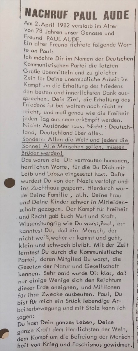 Bis zu seinem tödlichen Unfall am 2. April 1982 mit dem Fahrrad an der Kreuzung Heeper-/Ziegelstraße ist Paul Aude in der in Ostermarsch- und Friedensbewegung aktiv. Der Nachruf, höchstwahrscheinlich von Michel Knop verfasst, wird 1982 in der Stadtteilzeitung seiner Wohngebietsgruppe Ost der DKP veröffentlicht.