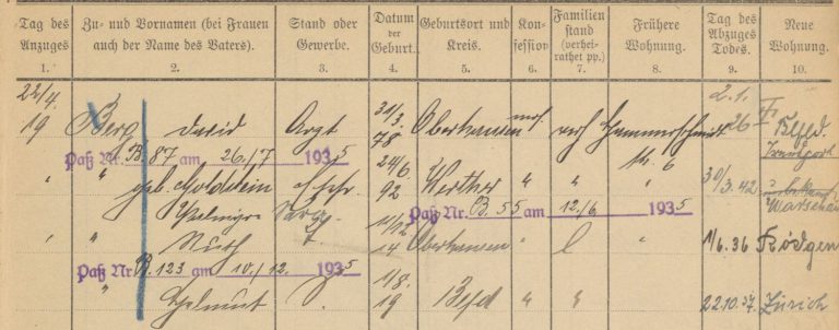 Palmyra Berg, ihre Schwester Grete und ihr Schwager Arthur haben die Shoah nicht überlebt. Palmyra wurde mit Wirkung vom 8. Mai 1945 für tot erklärt. Die Familie Goldstein wurde am 31. Juli 1942 nach Theresienstadt deportiert. Simon Goldstein starb am 29. Dezember 1942, Emilie Goldstein am 3. Februar 1943 und das Todesdatum von Else ist der 28. April 1943.